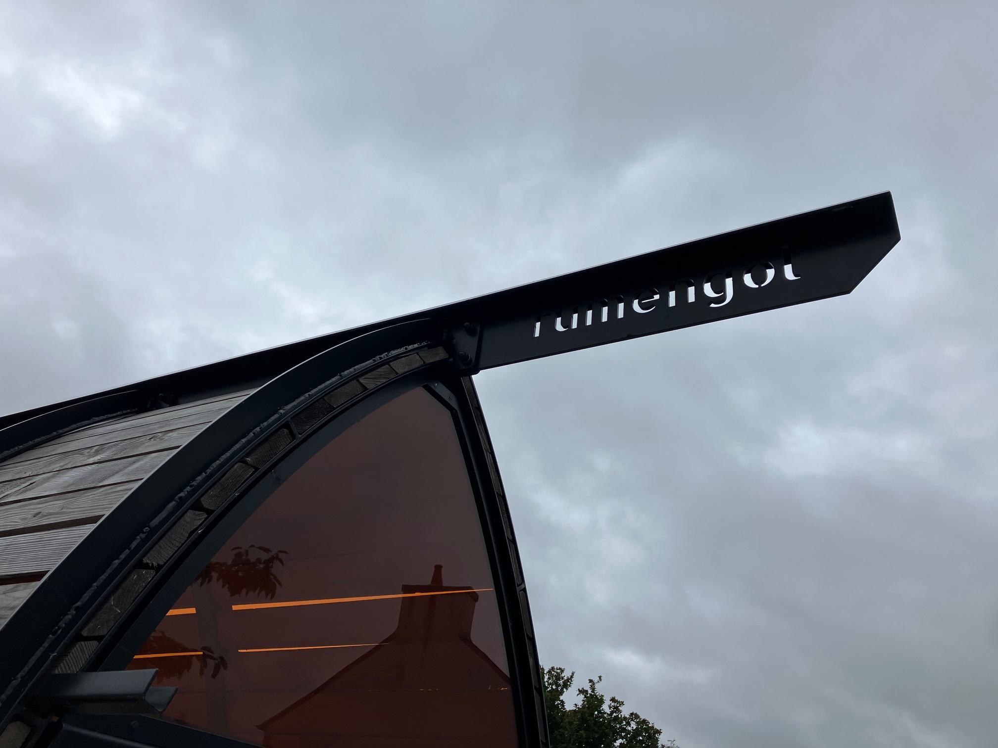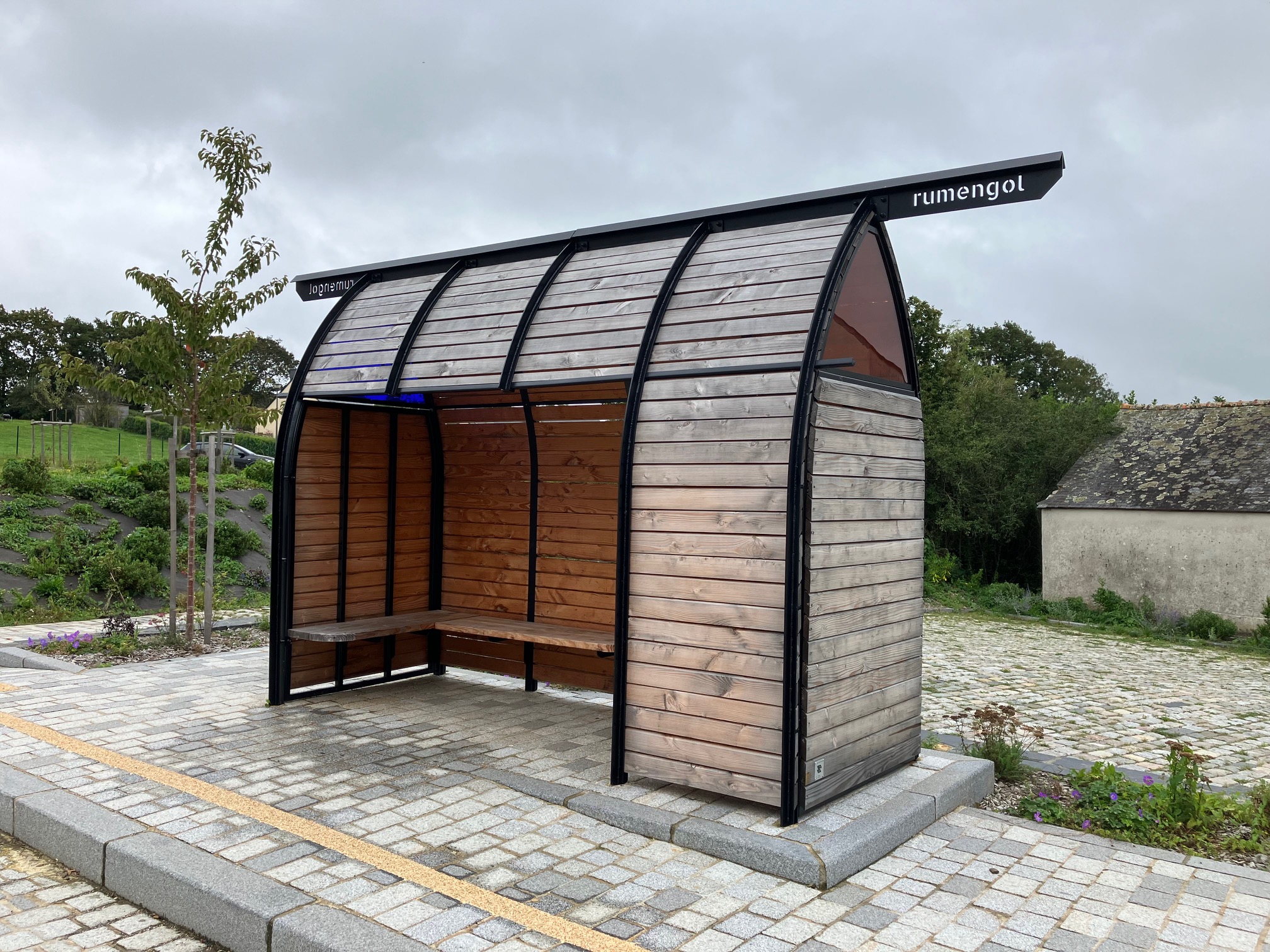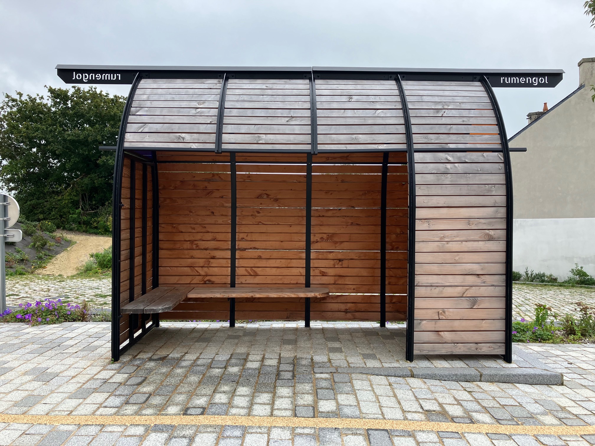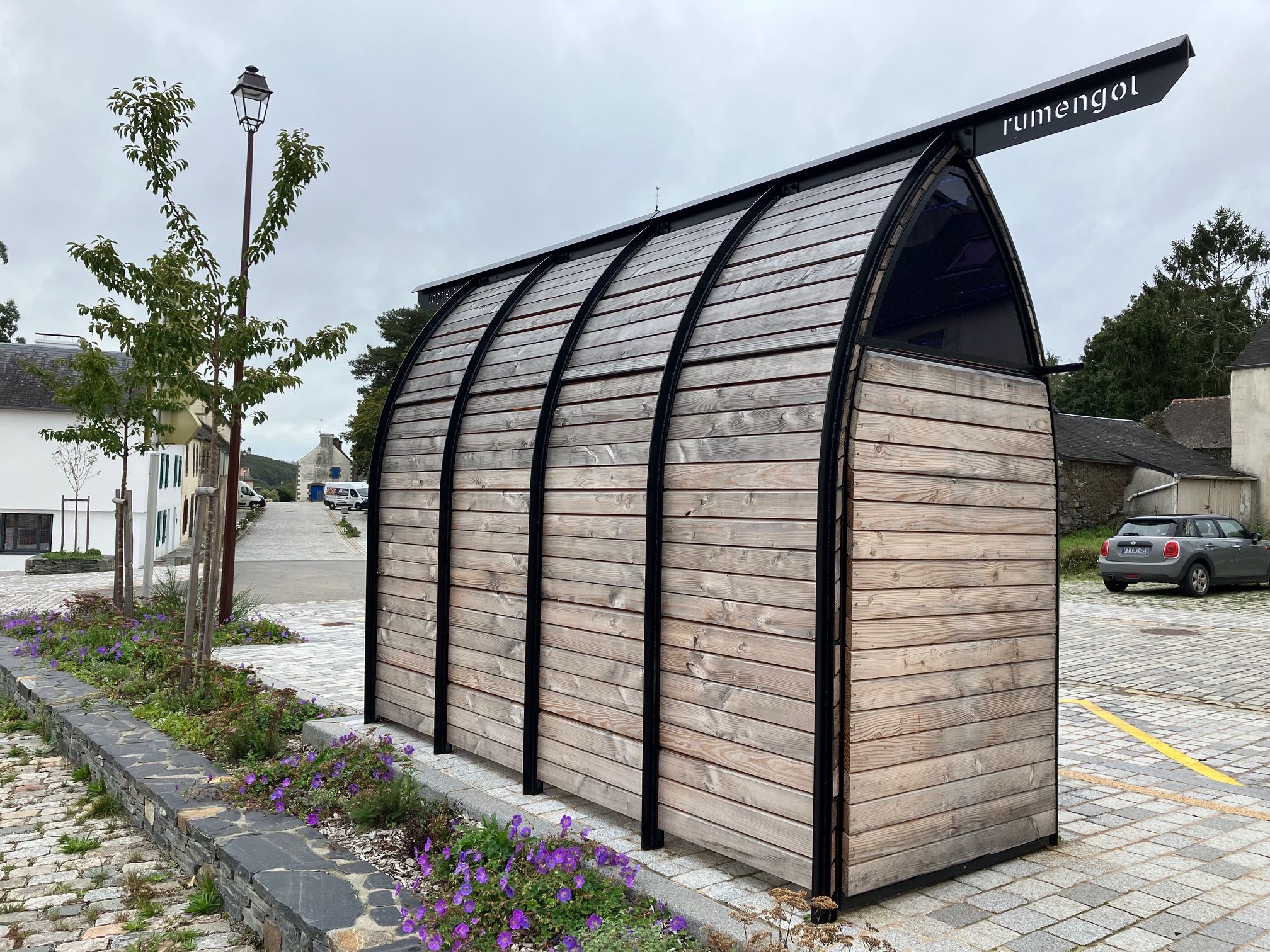 L’abri se compose de 5 paires de montants formant un tunnel d’ogives reliées par une poutre maîtresse. Chaque montant se composent de deux plats séparés par des entretoises et structurés par une nervure dorsale. Ce dispositif permet l’insertion d’un bardage en pin douglas dont le profil en parallélogramme permet le ruissellement de l’eau de pluie vers l’extérieur et une bonne protection au vent associée à une bonne respiration des planches. Ces clins participent à l’évocation du patrimoine maritime entourant le nom de Notre-Dame-De-Rumengol. La plupart des pièces sont démontables afin de faciliter l’entretien de l’abri. Ce denier intègre un banc en L proposant 4 places assises parmi la capacité de 10 offerte par l’abri. L’accès PMR est bien sûr pris en compte.