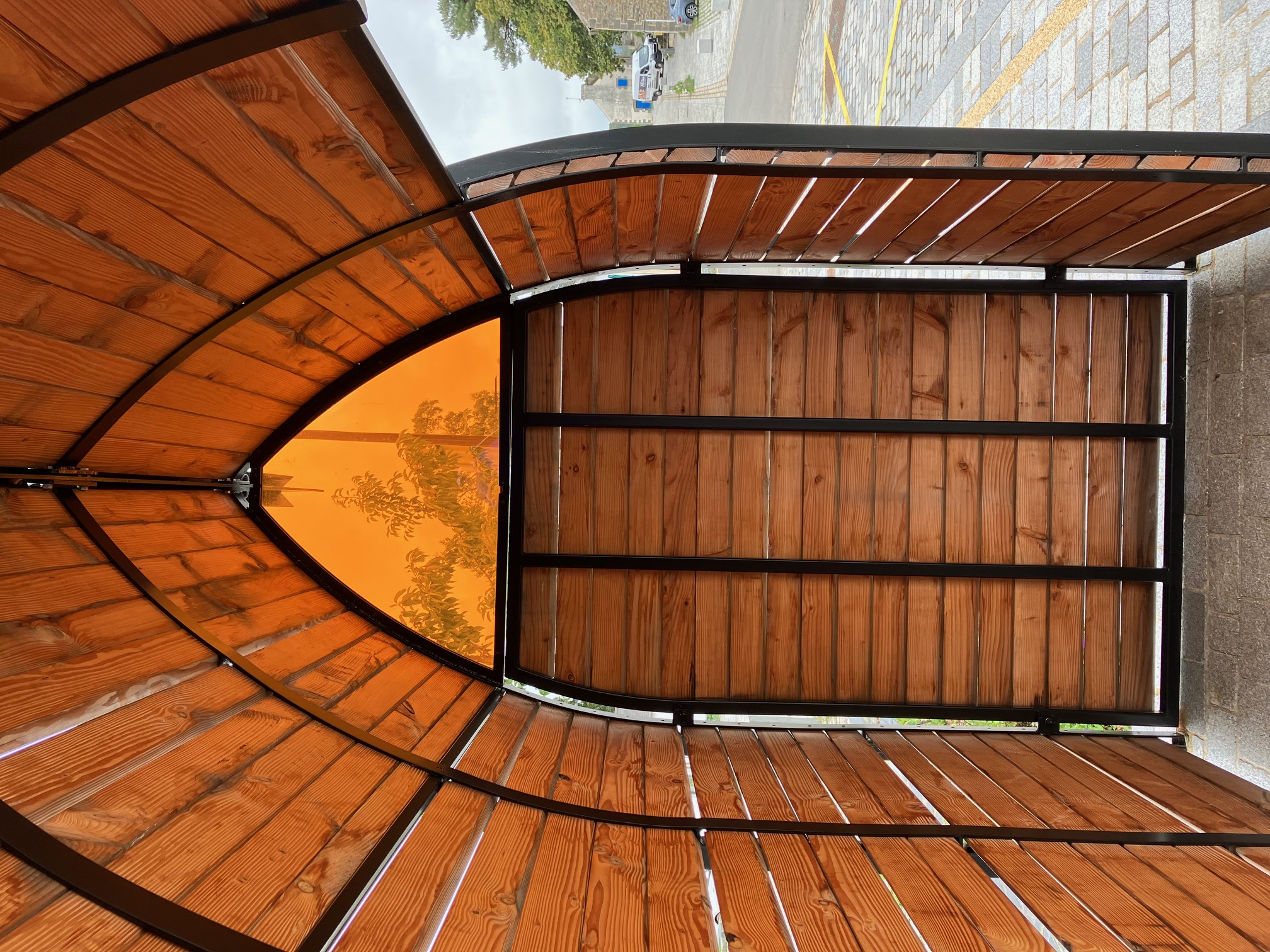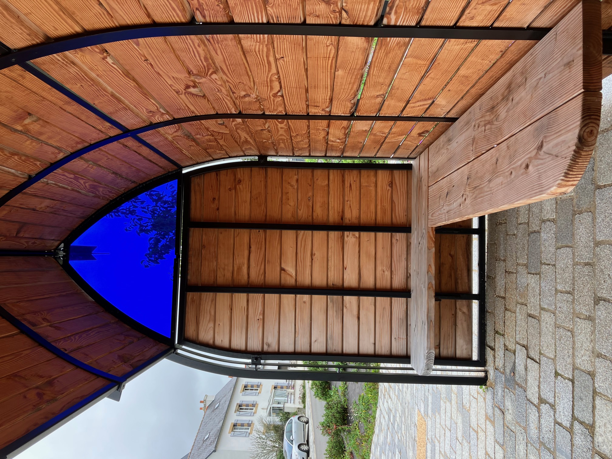Structure acier métallisée et thermolaquée garantissant pérennité. Possibilité d'utiliser un lot de planche de cryptomère du japon abattu par la mairie mais cette dernière n'a finalement pas pris le risque d'utiliser cette ressource à la pérennité incertaine.