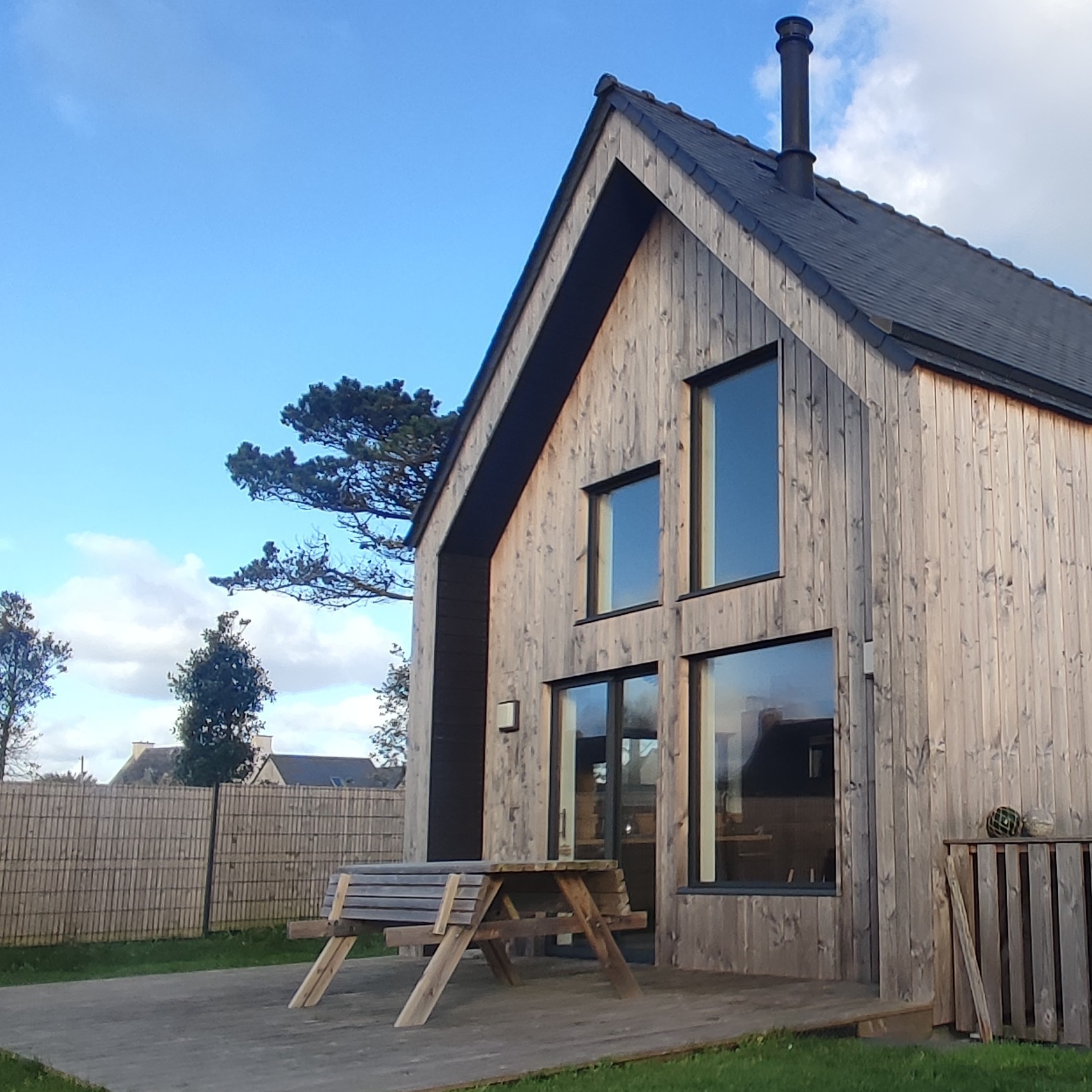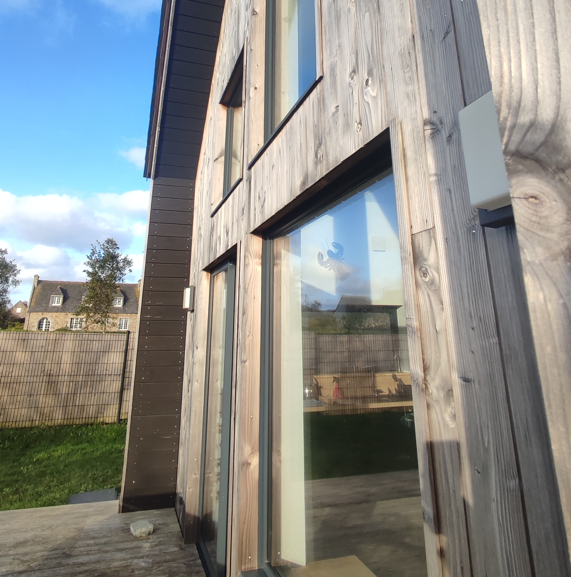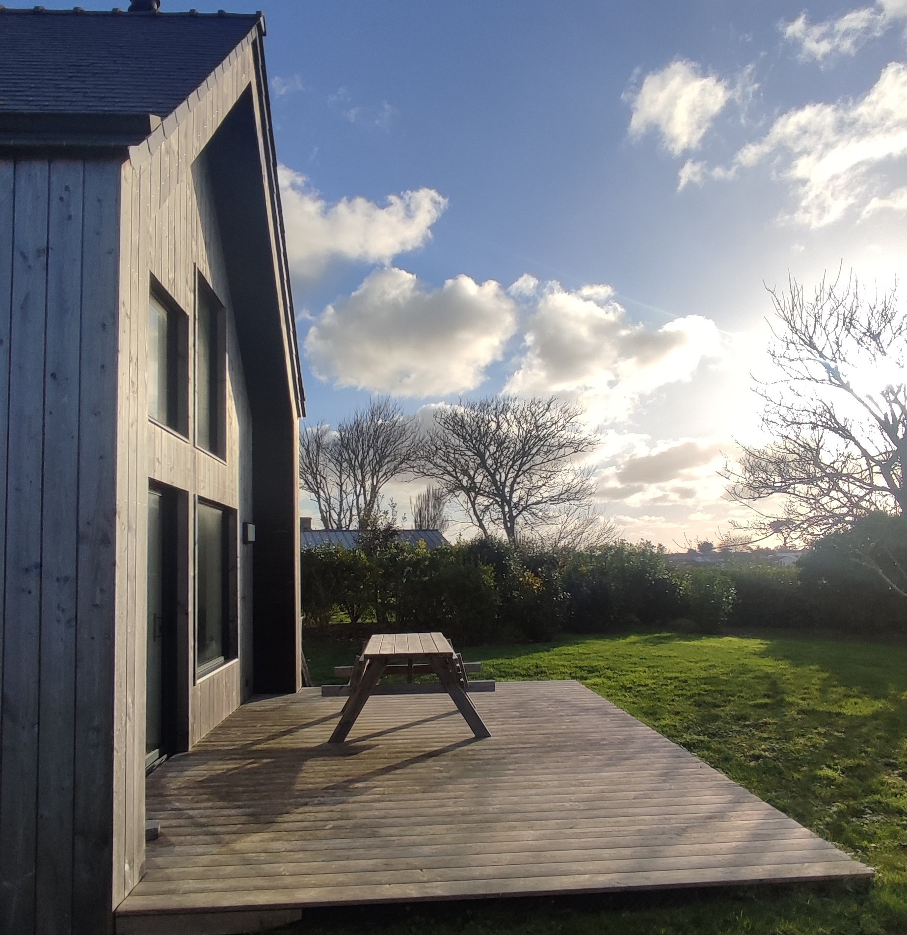Cette maison est conçue dans les principes du bio-climatisme, de forme compacte, elle lasse entrer le soleil au Sud tout en limitant les surchauffe que générerait un vitrage plus conséquent à l'Ouest. Elle est construite en matériaux bio-sourcés, charpente, ossature, terrasse en bois douglas. Isolée en ouate de cellulose, laine et fibre de bois, cette petite maison est très performante thermiquement