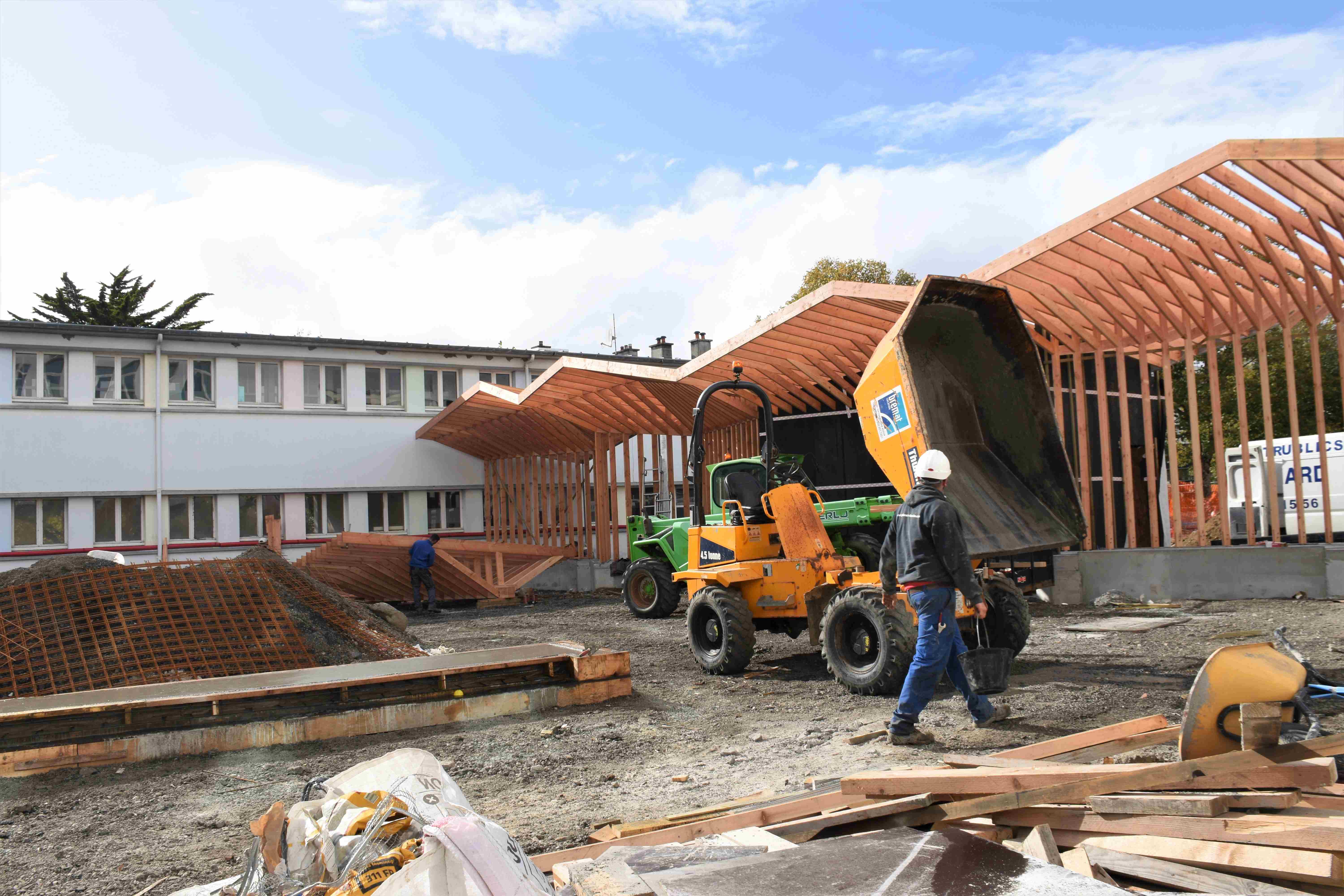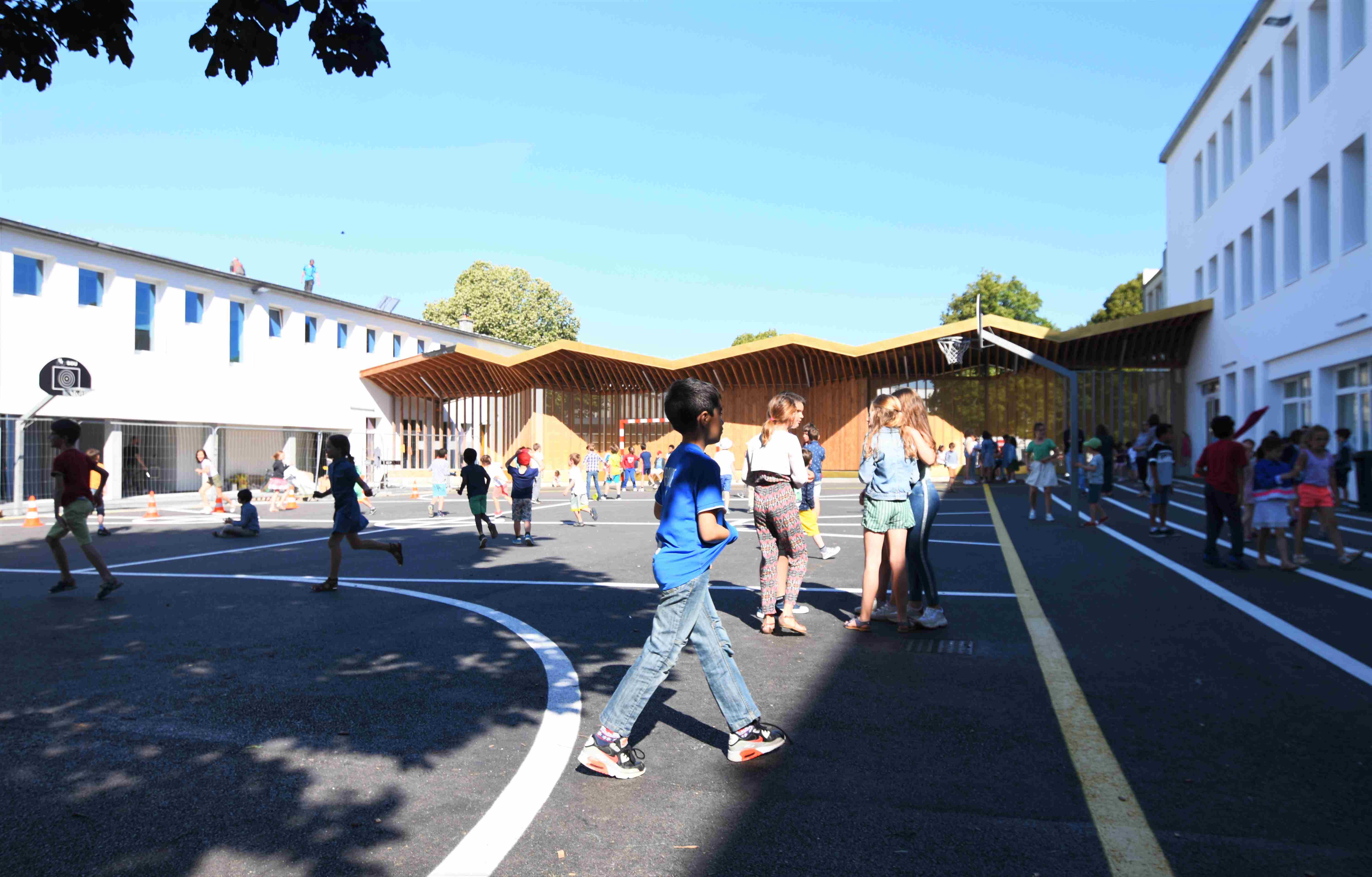 Initialement limitée à une rénovation énergétique, nous avons proposé que la transformation du groupe scolaire s’accompagne de la création d’un parvis et de préaux (172 et 213 m2) composés d’un assemblage rigoureux de pièces de Douglas. Sobrement rénové, l’école propose avec ces préaux-tangrams de répondre à plusieurs enjeux : Ils signalent le renouvellement du groupe scolaire ; composent un lieu d’attente pour les parents offrant convivialité, échanges et informations et deviennent objets d’animation et d’appropriation des activités des enfants, protégeant du soleil autant que de la pluie.