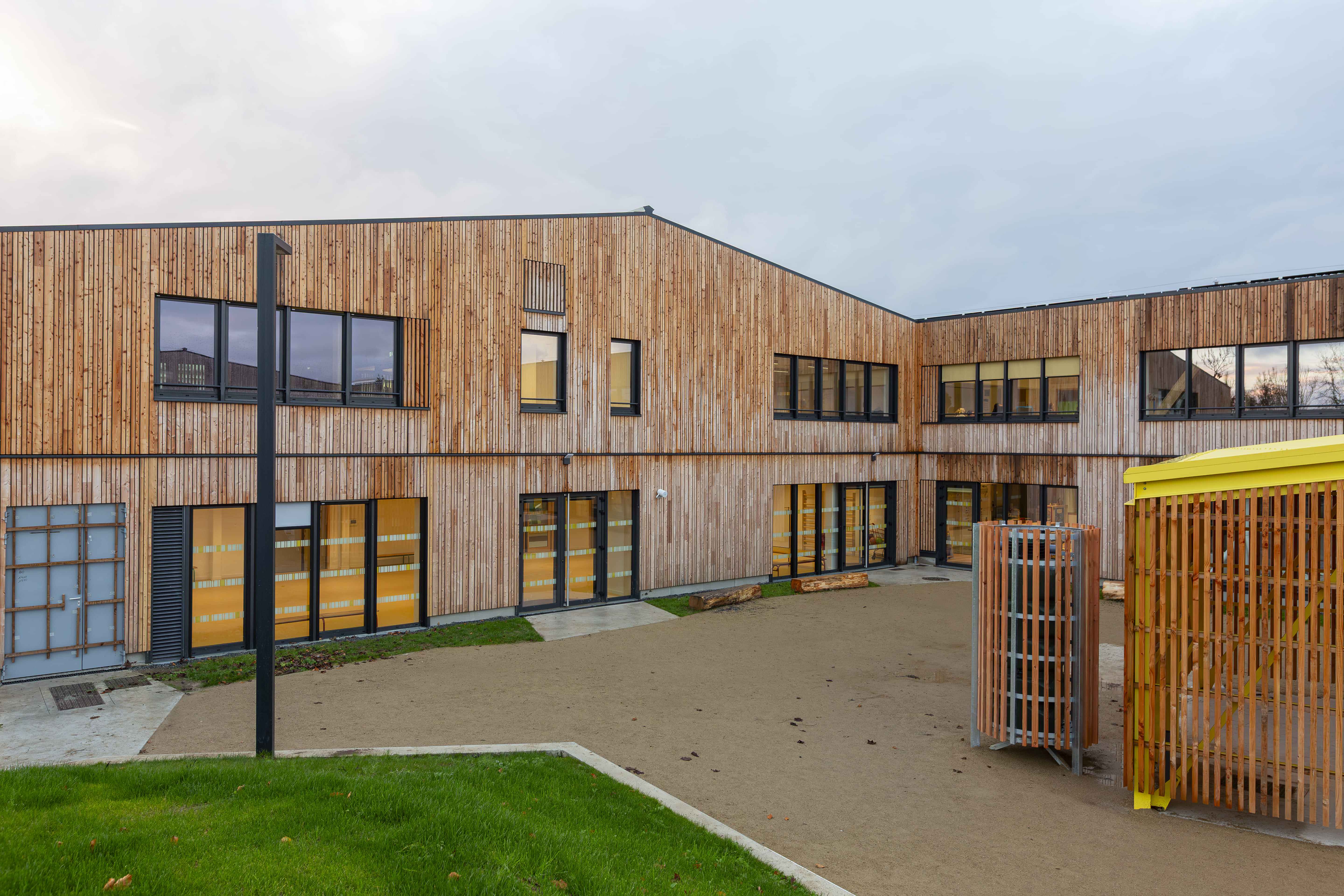 La reconstruction du groupe scolaire s’est inscrit dans une volonté du maitre d’ouvrage de réaliser un bâtiment à faible impact environnemental, le projet s’inscrit ainsi dans le référentiel E+C- & BBCA. Au stade de la conception, le projet aboutit au niveau Energie 3 Carbone 1 & BBCA niveau Excellent